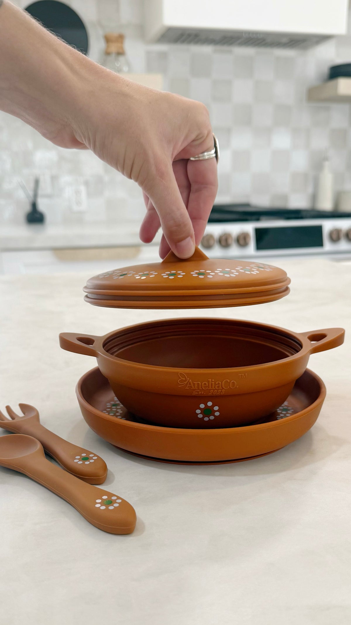 This set includes: a cup with lid and straw, suction cup bottom bowl with lid, suction cup bottom plate, and fork & spoon.